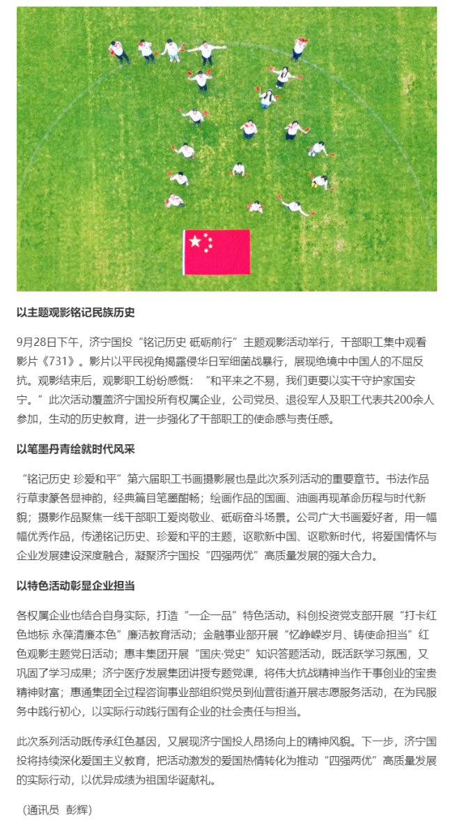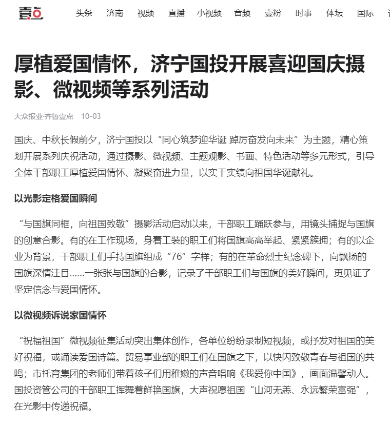 原鏈接:厚植愛國(guó)情懷,濟(jì)寧國(guó)投開展喜迎國(guó)慶攝影、微視頻等系列活動(dòng)