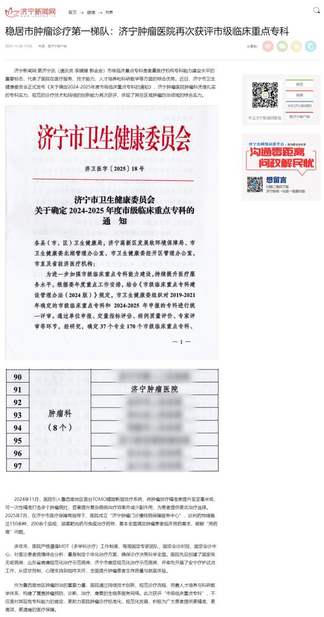 原鏈接:穩(wěn)居市腫瘤診療第一梯隊:濟寧腫瘤醫(yī)院再次獲評市級臨床重點專科