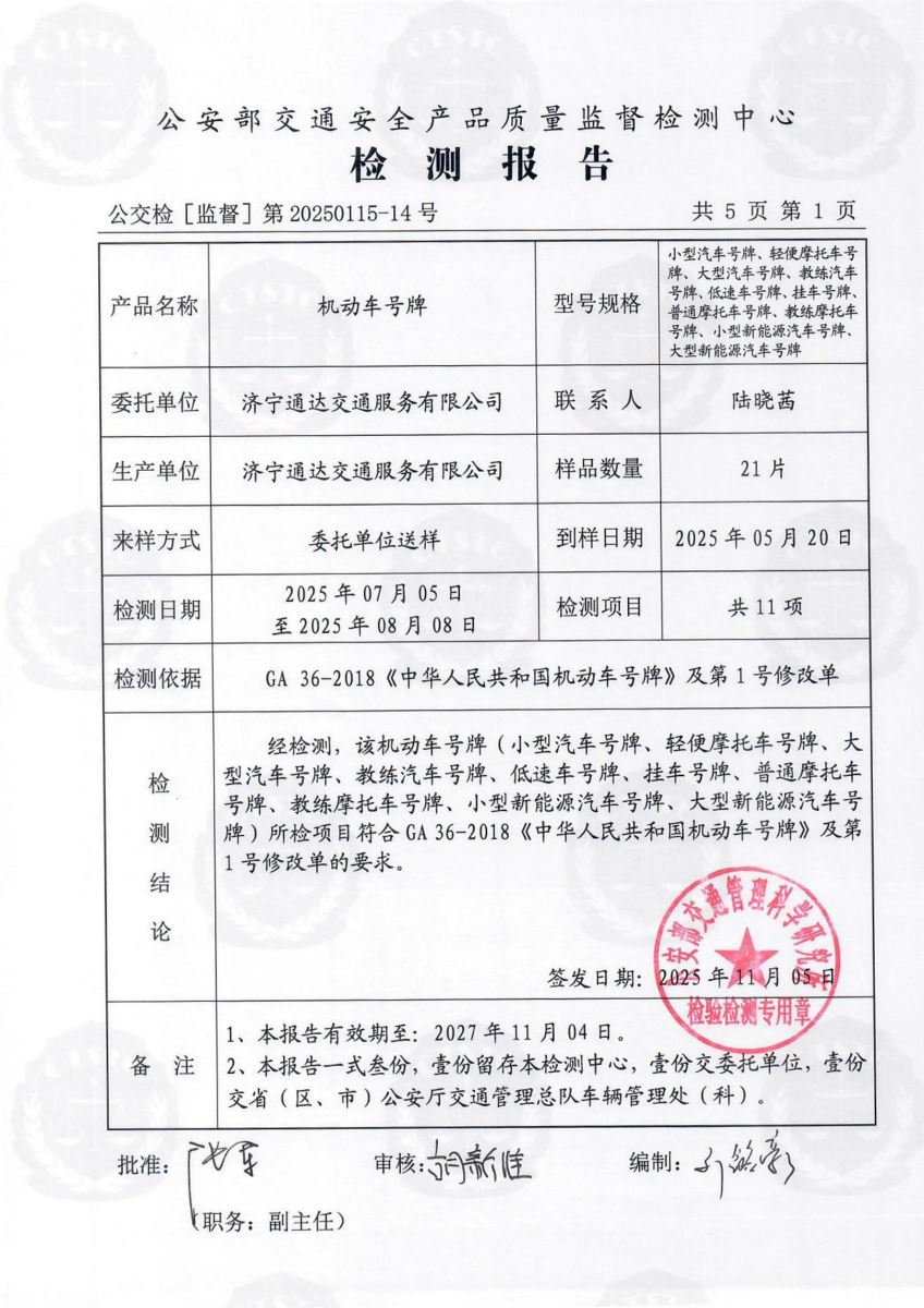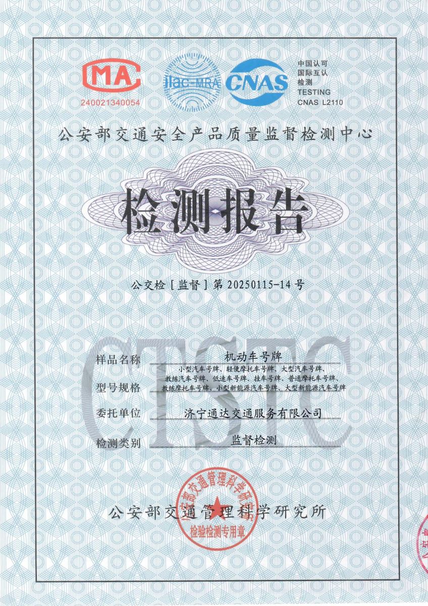 近日,從公安部交通安全產品質量監(jiān)督檢測中心傳來捷報:由濟寧通達交通服務有限公司(以下簡稱“通達公司”)生產制作的21面機動車號牌,經嚴格檢測,送檢樣品在材料質量、外觀尺寸、耐腐蝕性等所有檢測項目中均達到國家標準,全部順利通過國家標準認證。這標志著通達公司在承接全市機動車號牌生產制作業(yè)務一周年之際,以過硬的產品質量交上了一份令人滿意的答卷。